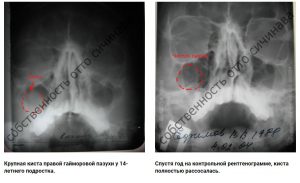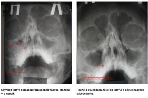 После избавления от отечно-воспалительного процесса и сокращения гипертрофии слизистой оболочки, наступает стойкое раскрытие соустий пазух. Впоследствии мы обучаем больным закапывать в нос различные лекарственные вещества, которые должны омывать и рассасывать кисту.