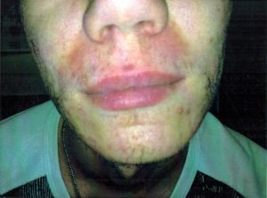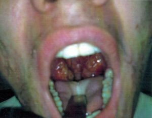 Крупные гнойные миндалины. Выражения себорея в области лица.